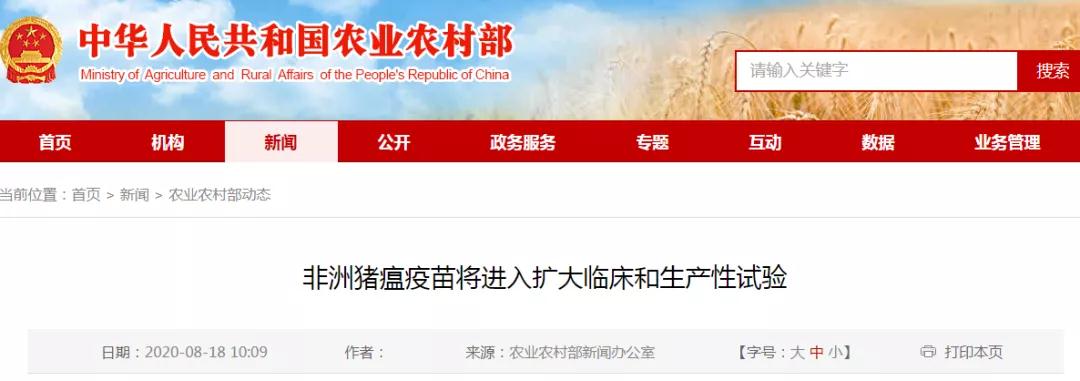 8月18日,从农业农村部获悉,由中国农业科学院哈尔滨兽医研究所自主研发的非洲猪瘟疫苗进展顺利,在前期完成候选疫苗株实验室和中间试制阶段研究的基础上,目前已完成疫苗环境释放试验,即将进入扩大临床试验和生产性试验阶段。力争早日进入安全证书申报和疫苗注册流程。
